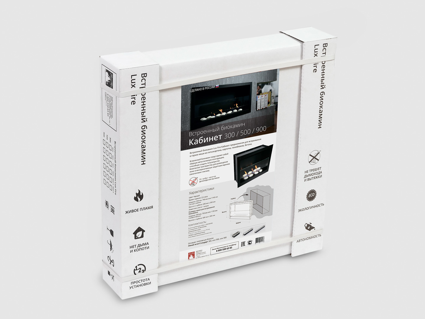 Представляет собой цельную металлическую конструкцию белого цвета класса XS, создающую полузакрытое безопасное пространство для огня с топливным блоком Lux Fire 250 XS ограниченную закаленным стеклом в котором горит живой огонь с углом обзора 180 градусов. Универсально подходит для встройки в нишу или подвеса на стену.