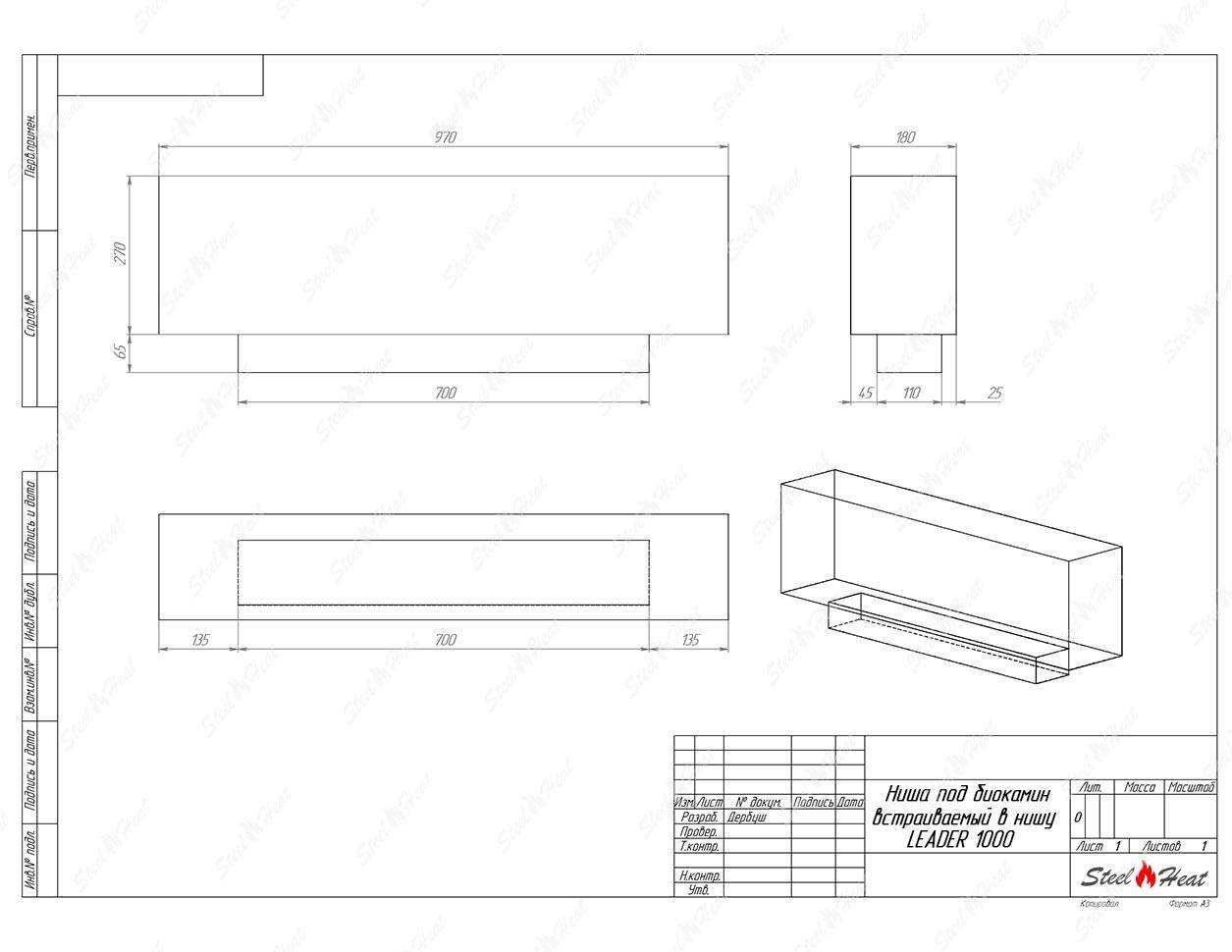 Встраиваемый Биокамин SteelHeat LEADER 1000 предназначен для встраивания в глухие ниши из гипсокартона, кирпича, пеноблоков, бетона.