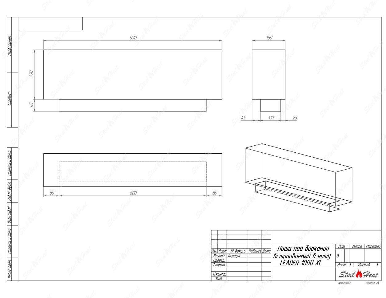 Встраиваемый Биокамин SteelHeat LEADER 1000 XL предназначен для встраивания в глухие ниши из гипсокартона, кирпича, пеноблоков, бетона.