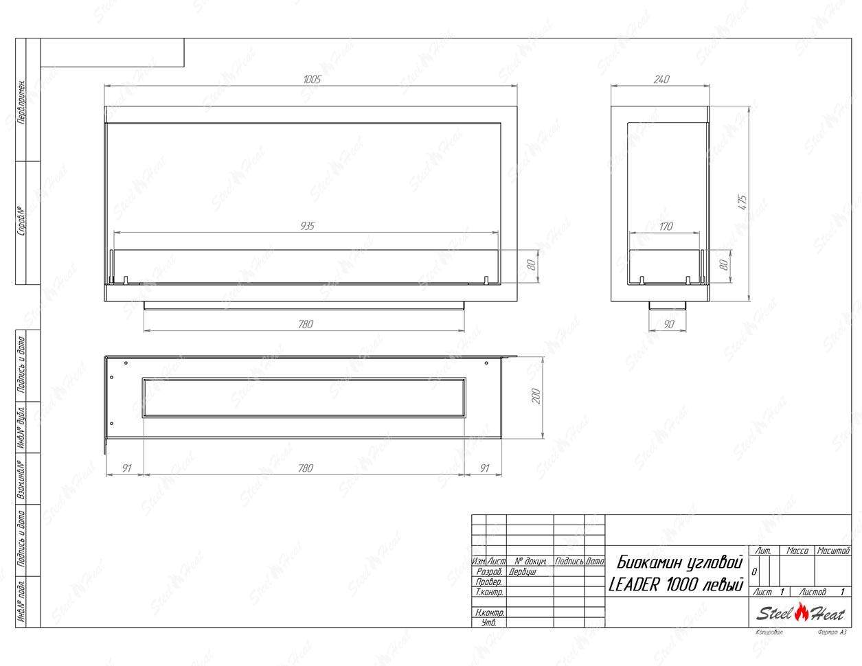 Встраиваемый Биокамин угловой SteelHeat Leader 1000 левый предназначен для встраивания в глухие ниши из гипсокартона, кирпича, пеноблоков, бетона.
