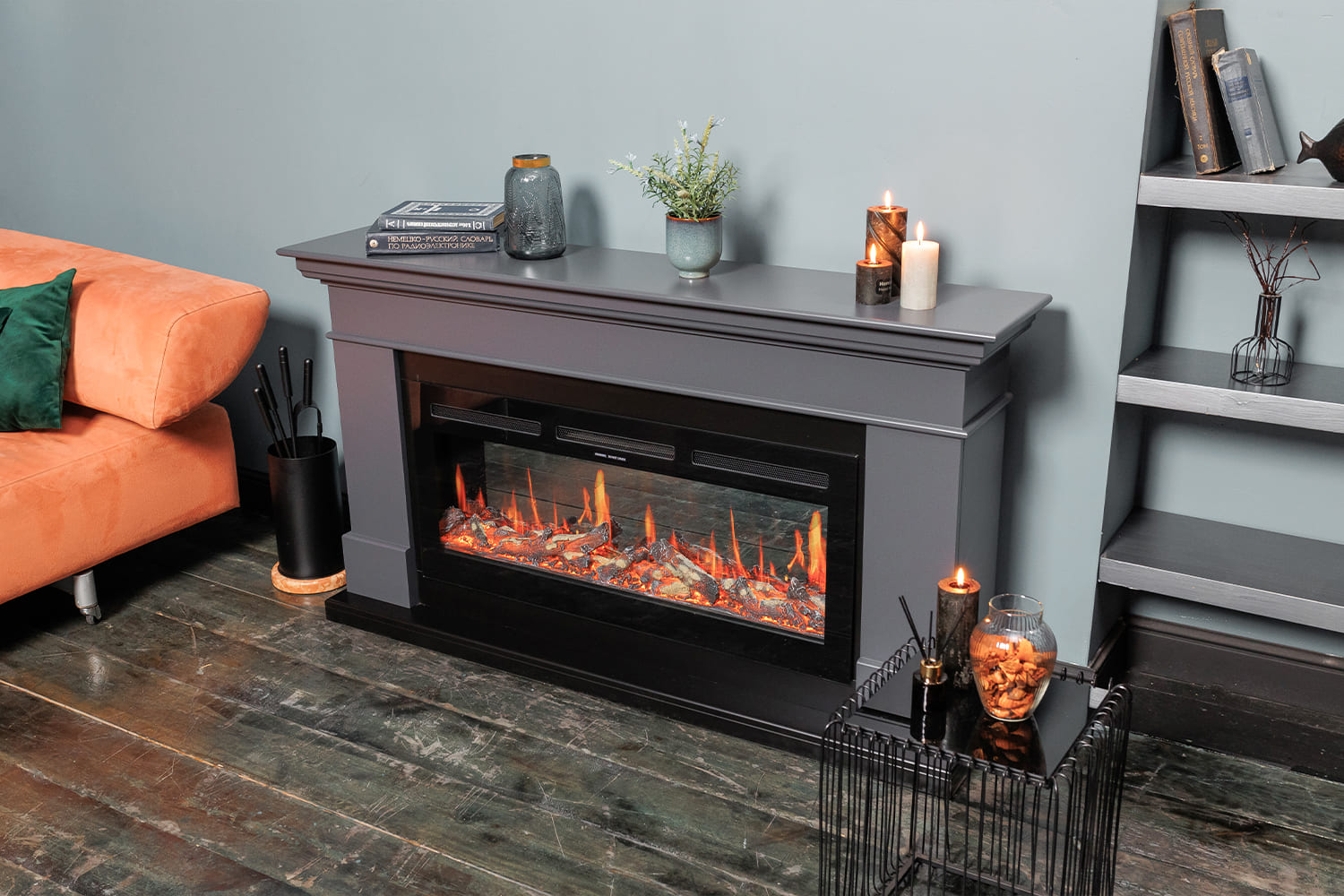 Каминокомплекты - наиболее приближенные к настоящему камину по внешнему виду. Такая конструкция является более сложной, габаритной. В собранном состоянии она является стационарным предметом, который состоит из очага, обрамленного декоративным порталом. По факту вы приобретаете уже готовое изделие, которое осталось лишь установить в выбранном месте и подключить к источнику электропитания.