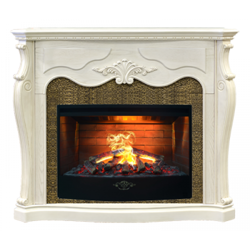 Портал сразу же привлекает своим богатым убранством. Углы боковых стенок оформлены пилястрами, стилизованными под изящные мебельные ножки. Они украшены резными завитками. Ножки плавно перетекают в широкую каминную крышку. Ее карниз украшен цепочкой мелкой резьбы. Очаг обрамлен арочной конструкцией, которая отличается плавными изогнутыми линиями. Верхняя ее часть украшена сложным растительным орнаментом. Заполнение арки оформлено под металл. Устанавливается вся эта конструкция на невысокое изогнутое основание.