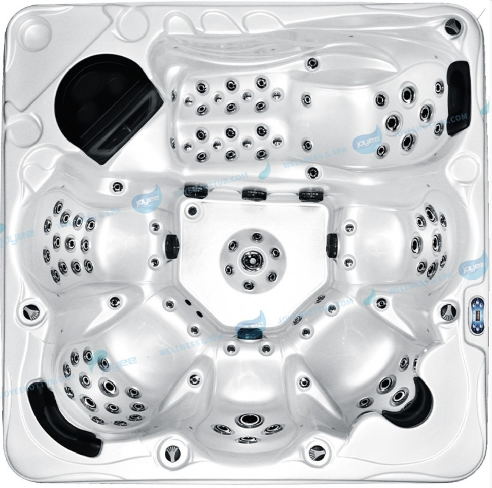 Габариты бассейна около 220×220 см позволяют комфортно разместить до 5–6 пользователей, включая лежак для полного расслабления